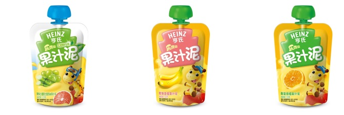 上面的儿童泥类食品包装设计和下面的果汁泥类包装设计,一看就知道是亨氏的产,为什么呢?